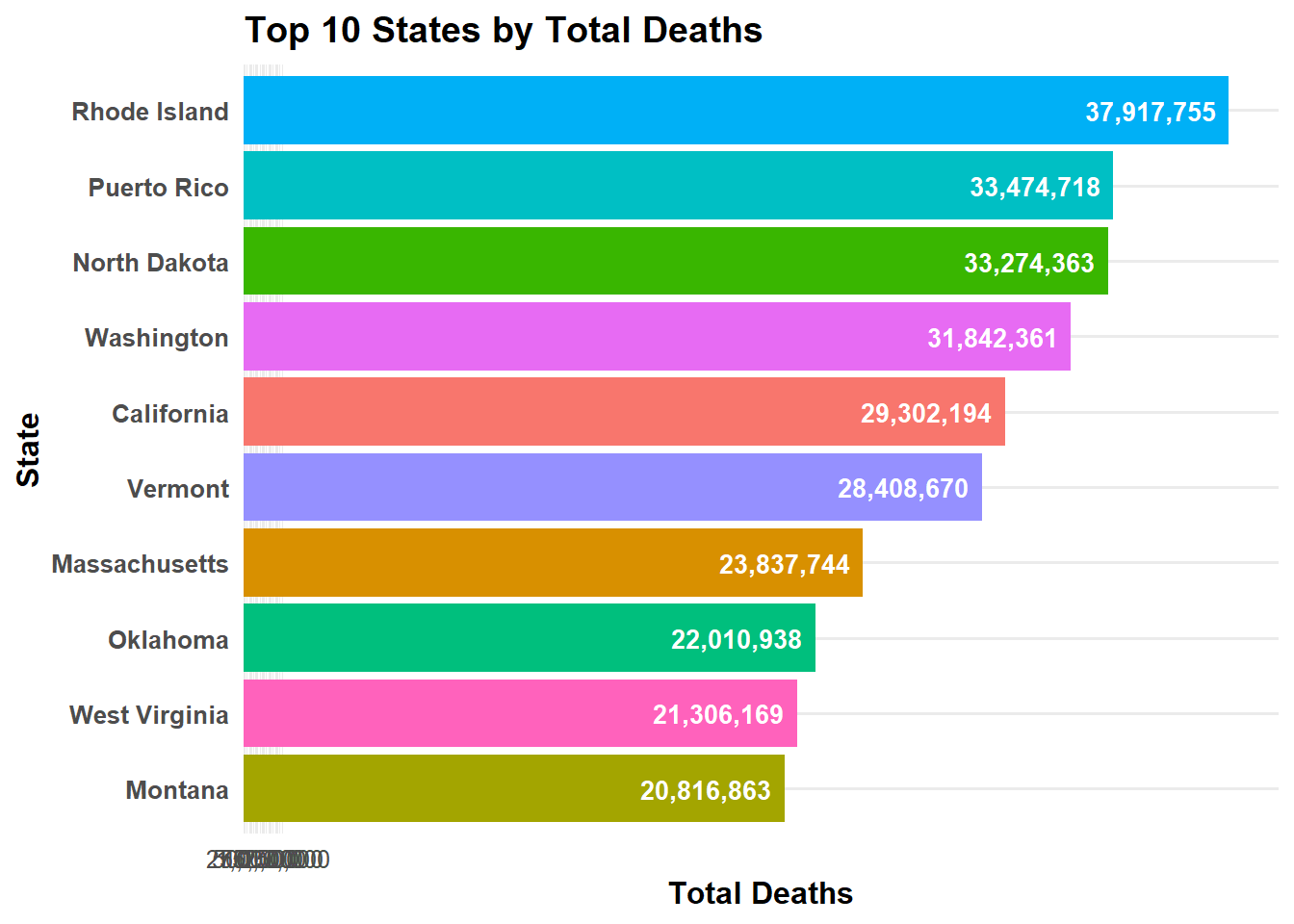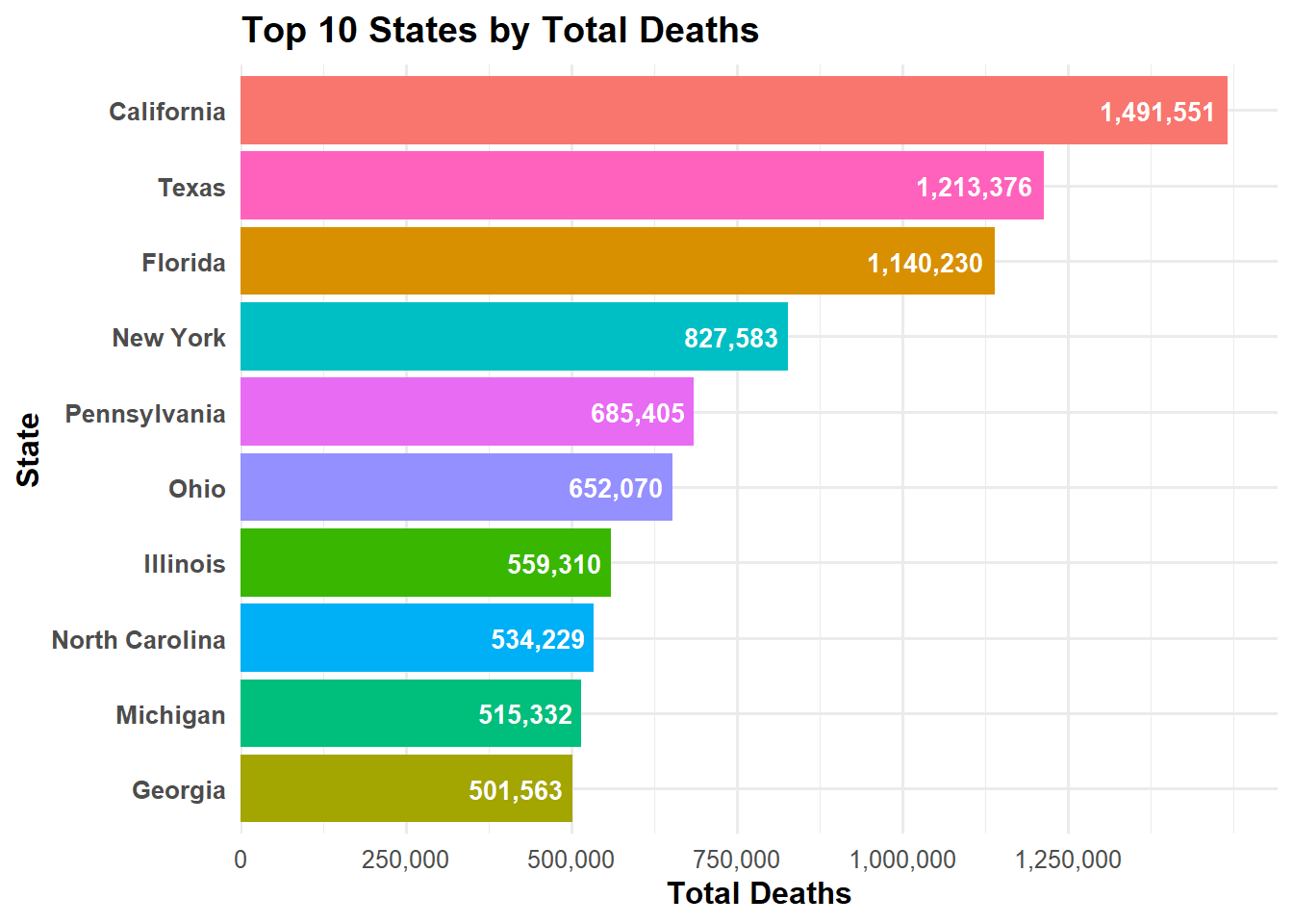 state_totals <- cdc_clean %>%filter(state !="United States") %>%group_by(state) %>%summarise(total_deaths =sum(total_deaths, na.rm =TRUE), .groups ="drop")# this gives us the top 10 states by total deaths, which we can plot in a horizontal bar chart.top10 <- state_totals %>%arrange(desc(total_deaths)) %>%slice_head(n =10)# horizontal bar chart: states on y-axis, total_deaths on x-axis ggplot(top10, aes(x =reorder(state, total_deaths), y = total_deaths, fill = state)) +geom_col() +geom_text(aes(label =comma(total_deaths)),hjust =1.1, # move text slightly inside barcolor ="white",fontface ="bold",size =3.5 ) +coord_flip() +# flip coordinates for horizontal barsscale_fill_hue() +scale_y_continuous(breaks =seq(0, max(top10$total_deaths, na.rm =TRUE), by =250000),labels = comma,expand =expansion(mult =c(0, 0.05)) ) +labs(title ="Top 10 States by Total Deaths",x ="State",y ="Total Deaths" ) +theme_minimal(base_size =12) +theme(plot.title =element_text(face ="bold"),axis.title.x =element_text(face ="bold"),axis.title.y =element_text(face ="bold"),axis.text.y =element_text(face ="bold"),legend.position ="none" )