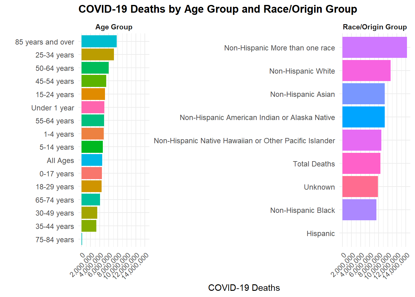 We can also explore how pneumonia deaths relate to COVID-19 deaths, or how influenza deaths compare across different race and Hispanic origin groups.