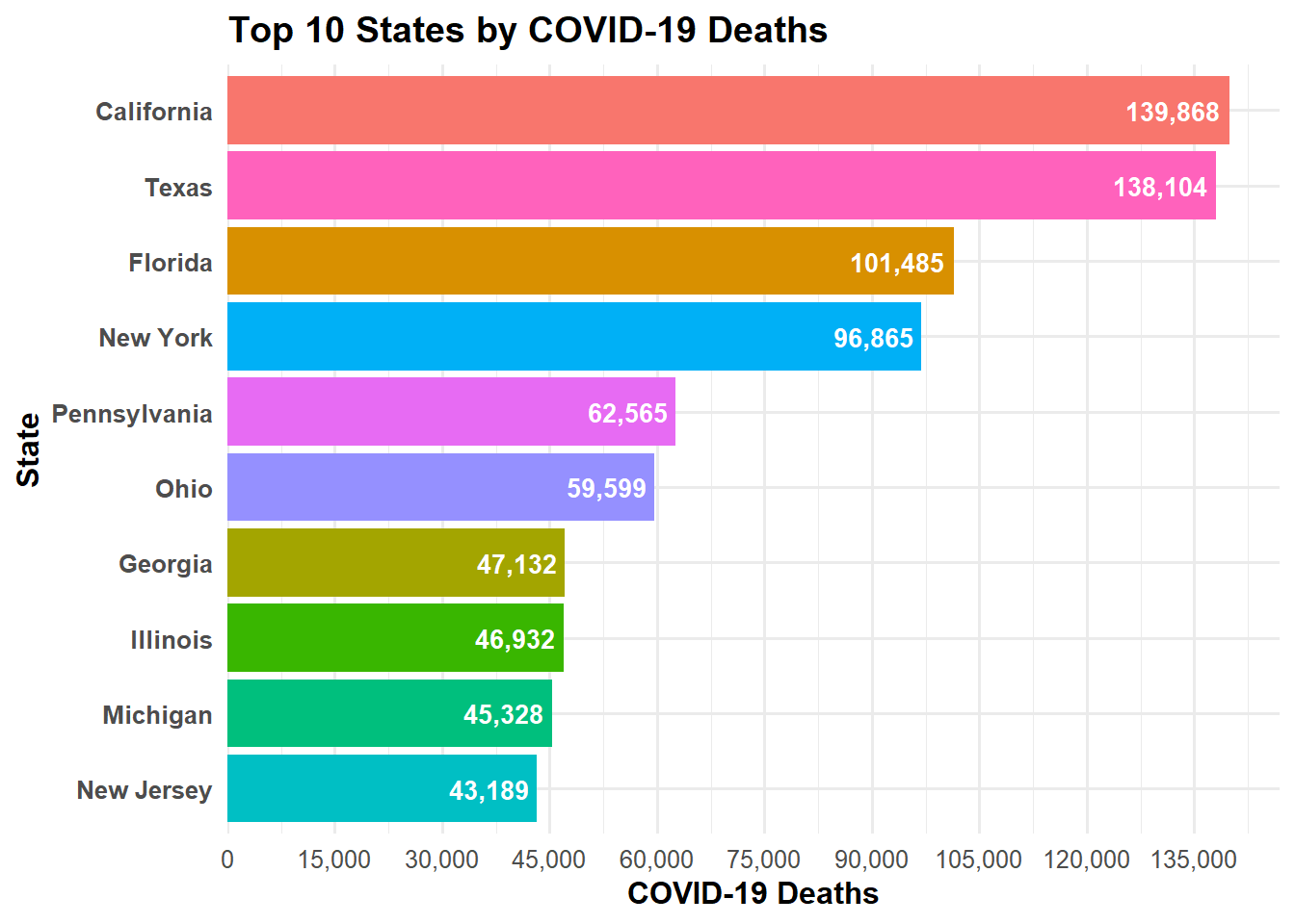 library(dplyr)library(ggplot2)library(scales)# top 10 states by covid deaths (excluding US aggregate; merged NYC into NY)covid_top10 <- cdc_clean %>%filter(state !="United States") %>%mutate(state =ifelse(state =="New York City", "New York", state)) %>%group_by(state) %>%summarise(covid_deaths =sum(covid_deaths, na.rm =TRUE), .groups ="drop") %>%arrange(desc(covid_deaths)) %>%slice_head(n =10)ggplot( covid_top10,aes(y =reorder(state, covid_deaths), x = covid_deaths, fill = state)) +geom_col() +geom_text(aes(label =comma(covid_deaths)),hjust =1.1,color ="white",fontface ="bold",size =3.5 ) +scale_fill_hue() +scale_x_continuous(breaks =seq(0, max(covid_top10$covid_deaths, na.rm =TRUE), by =15000),labels = comma,expand =expansion(mult =c(0, 0.05)) ) +labs(title ="Top 10 States by COVID-19 Deaths",x ="COVID-19 Deaths",y ="State" ) +theme_minimal(base_size =12) +theme(plot.title =element_text(face ="bold"),axis.title.x =element_text(face ="bold"),axis.title.y =element_text(face ="bold"),axis.text.y =element_text(face ="bold"),legend.position ="none" )