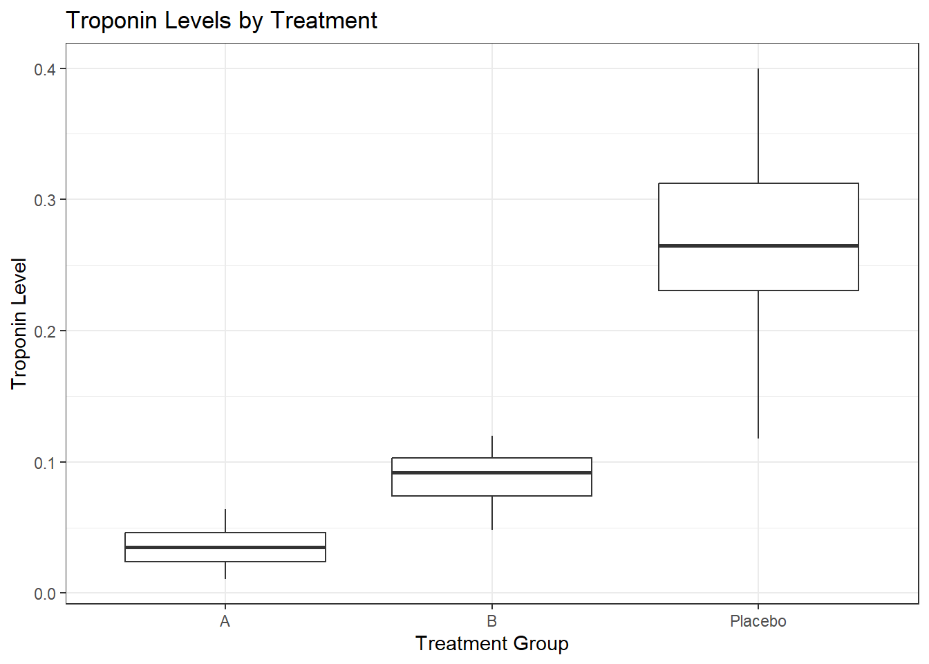 labs(title = "Troponin Levels by Treatment", x = "Treatment Group", y = "Troponin Level") +
